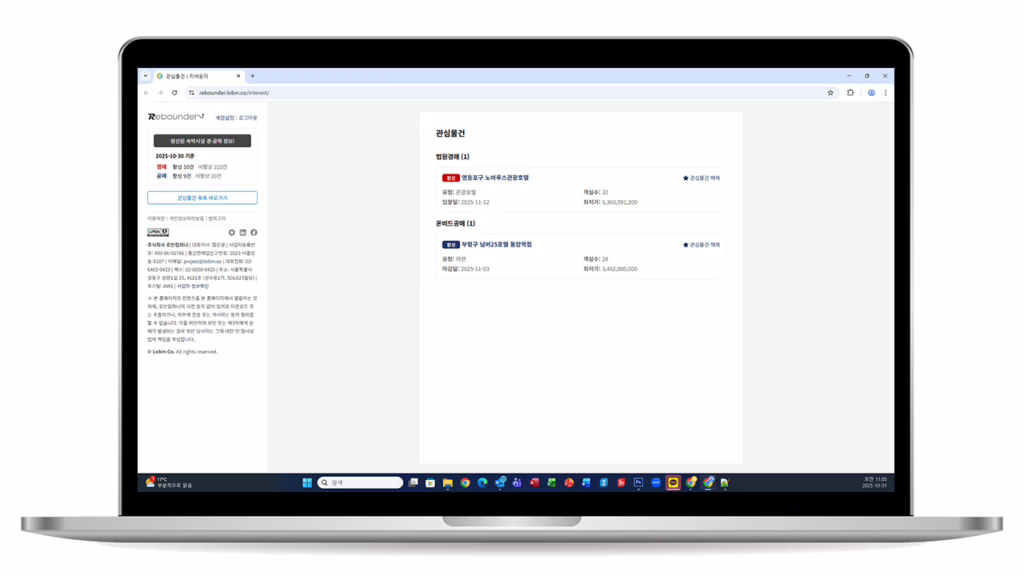 리바운더에 회원으로 가입하는 경우, 나만의 관심물건을 설정 또는 해제할 수 있습니다. 유찰 이후 재입찰이 진행되는 경우 해당 물건에 대한 정보를 신속하게 파악하여 대응할 수 있습니다. 현재 회원제는 무료로 운영되고 있습니다.